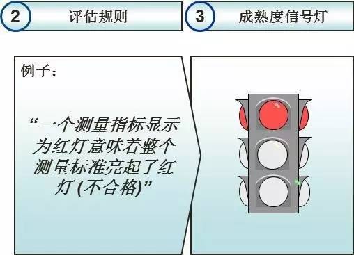 红黄绿灯的评价规则分别是:红灯:测量结果为“否” 且 至少有一个项目未达标 且 改进措施中包括对目标的调整 黄灯:测量结果为“否” 且 需执行一项改进措施并已就此达成共识 且 在完成规定的改进措施后能达到所有项目目标