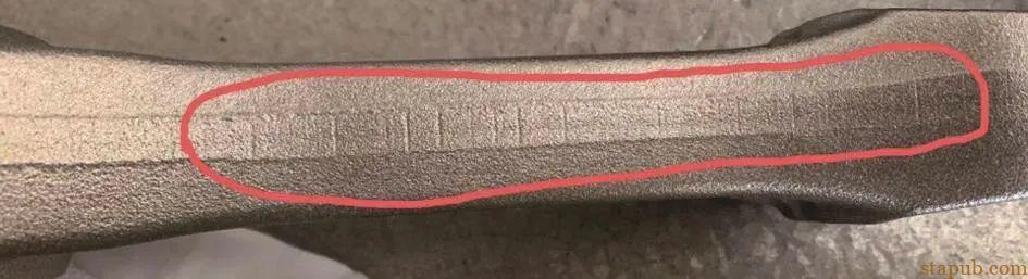 ⑴发生问题。连杆大部分表面都是非加工面,且表面质量要求很高,一旦出现折纹只能报废,导致连杆废品率高达7%左右,造成极大的浪费,折纹实物如图5所示。