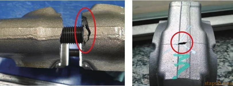 ⑴发生问题。连杆胀断面的金属掉渣数量、形状、厚度及长度都有相应的技术要求,如某连杆胀断面的金属掉渣应少于3个且为片状、厚度不大于2mm、总长应小于4mm。实际生产中连杆胀断掉渣废品率高达1%左右,因胀断掉渣的发现工序较晚,因此造成了极大的浪费,较高的胀断掉渣废品率提高了产品的生产成本。连杆胀断掉渣如图16所示。