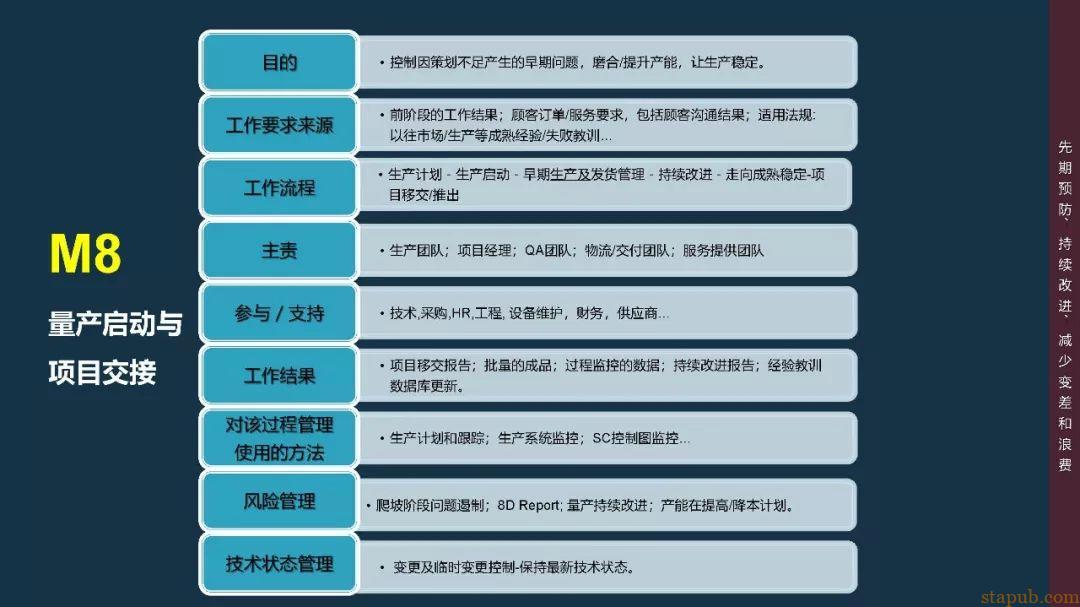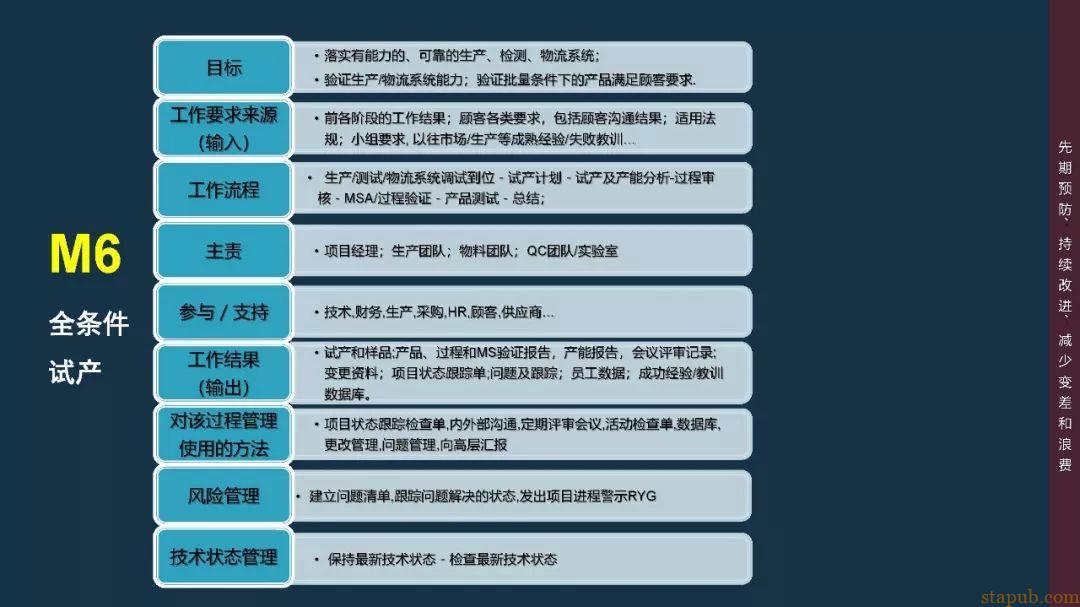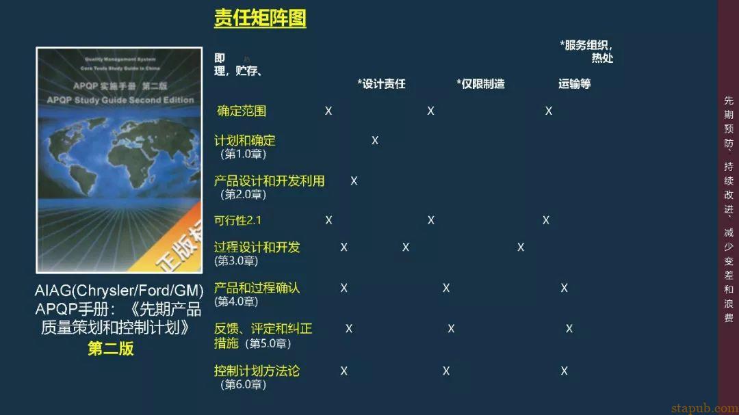 APQP=Advanced Product Quality Planning 中文意思是:产品质量先期策划,是QS9000/IATF16949质量管理体系的一部分。APQP产品质量策划定义为一种用来确定和制定确保某产品使顾客满意所需步骤的结构化方法。目标是促进与所涉及每一个人的联系,以确保所要求的步骤按时完成。有效的产品质量策划依赖于高层管理者对努力达到使顾客满意这一宗旨的承诺。产品质量策划是一种结构化的方法。