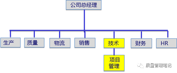 最低效的架构,项目管理往往放在技术部门,项目经理往往就是一个工程师,协调跨部门资源难度大;多为Local民营企业。
